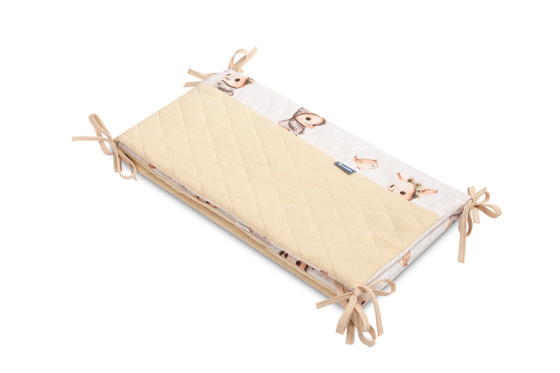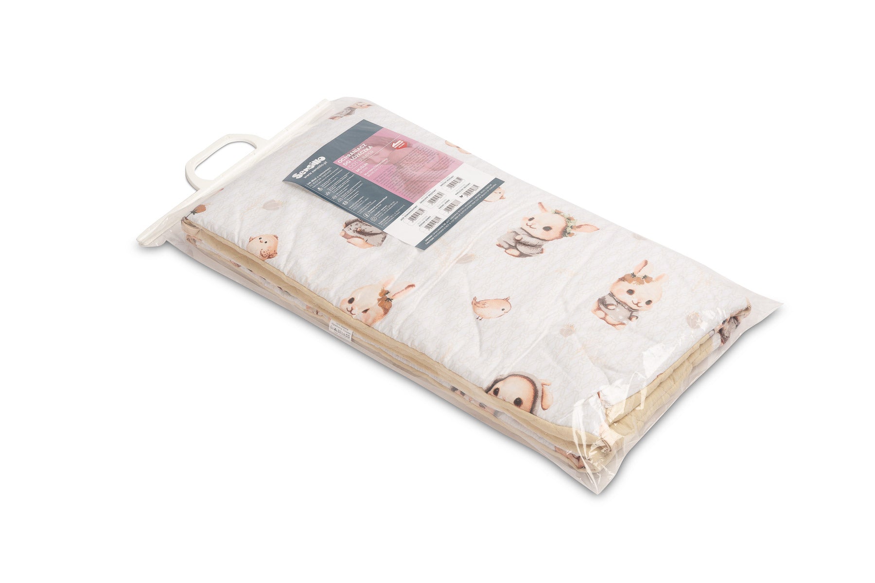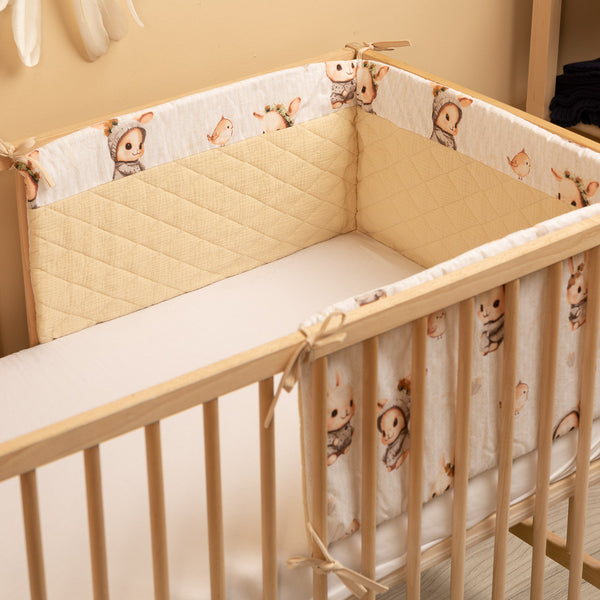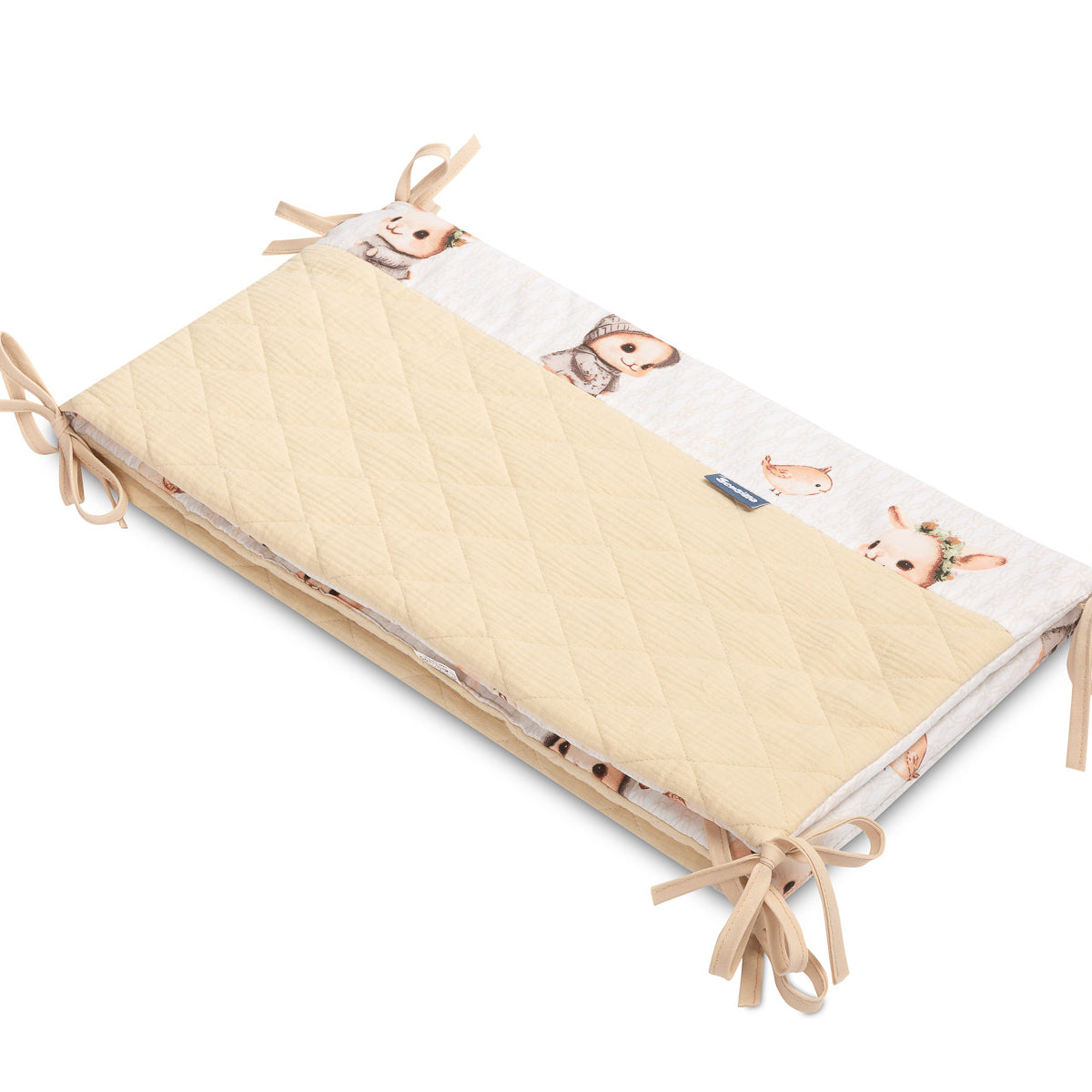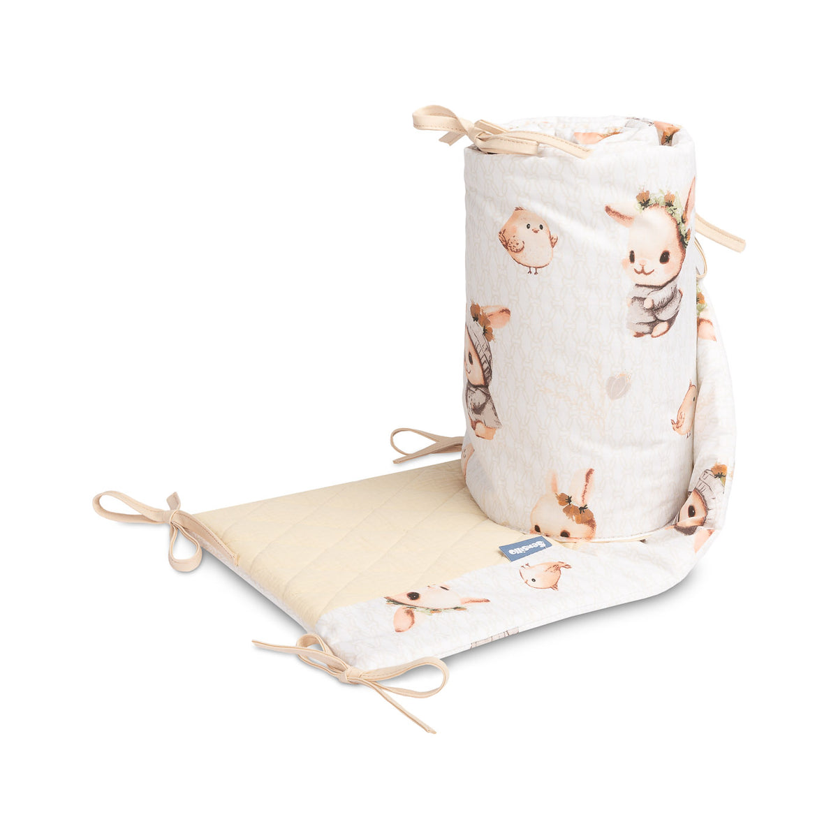 Marginea de protecție pentru pătuț se potrivește fiecărui pătuț standard pentru copii. Marginea este realizată din bumbac moale imprimat și muselină plăcută la atingere. Umplutura din poliester va proteja bebelușul de accidentări în timpul mișcării în pătuț. Marginea rămâne la locul ei datorită panglicilor cu care se fixează de barele pătuțului. Este destinată unui pătuț cu dimensiunile de 120x60 cm. Marginea va fi un accesoriu excelent pentru echipamentul copilului.
