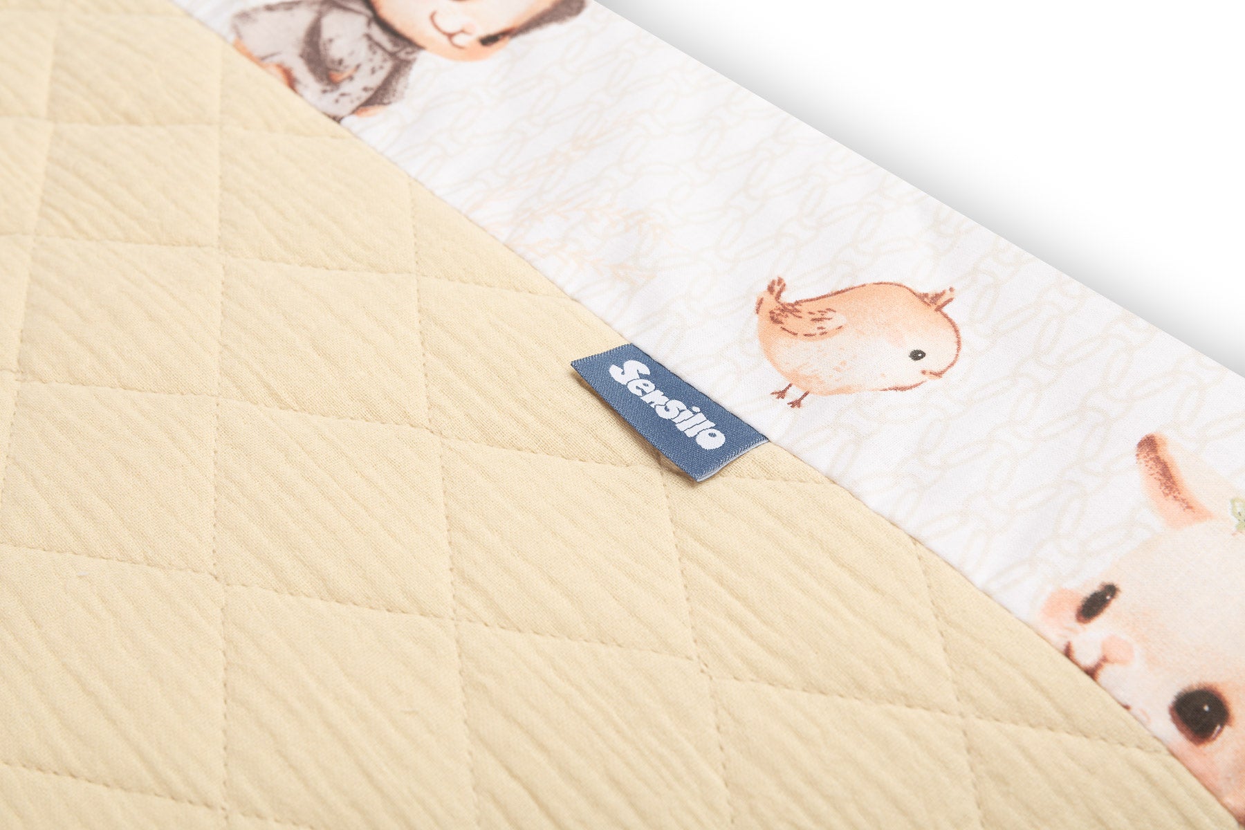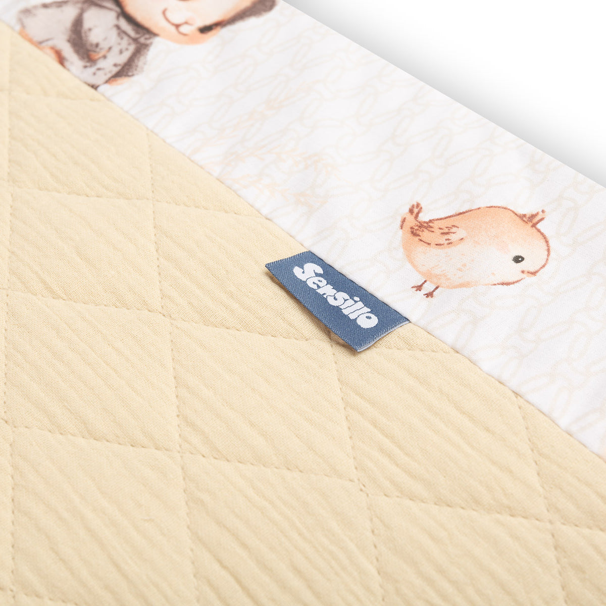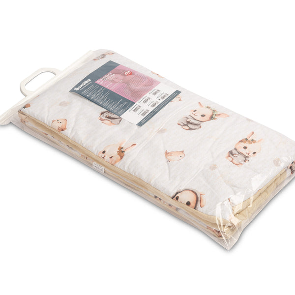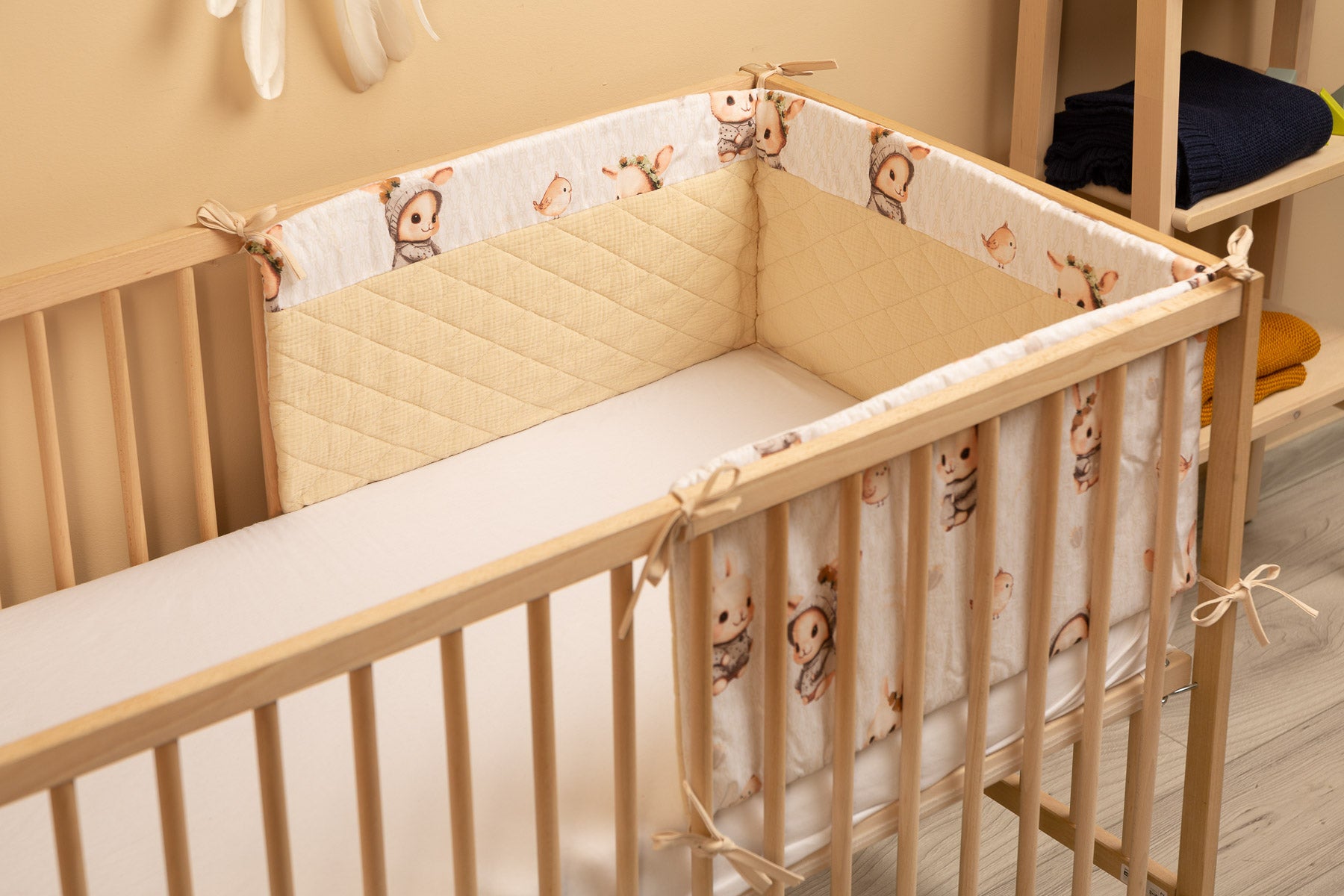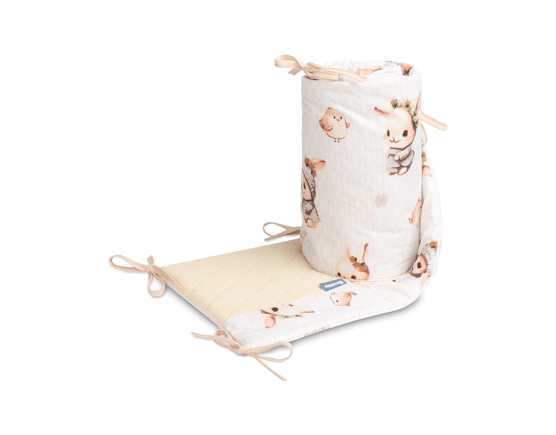 Marginea de protecție pentru pătuț se potrivește fiecărui pătuț standard pentru copii. Marginea este realizată din bumbac moale imprimat și muselină plăcută la atingere. Umplutura din poliester va proteja bebelușul de accidentări în timpul mișcării în pătuț. Marginea rămâne la locul ei datorită panglicilor cu care se fixează de barele pătuțului. Este destinată unui pătuț cu dimensiunile de 120x60 cm. Marginea va fi un accesoriu excelent pentru echipamentul copilului.