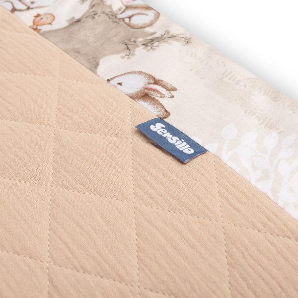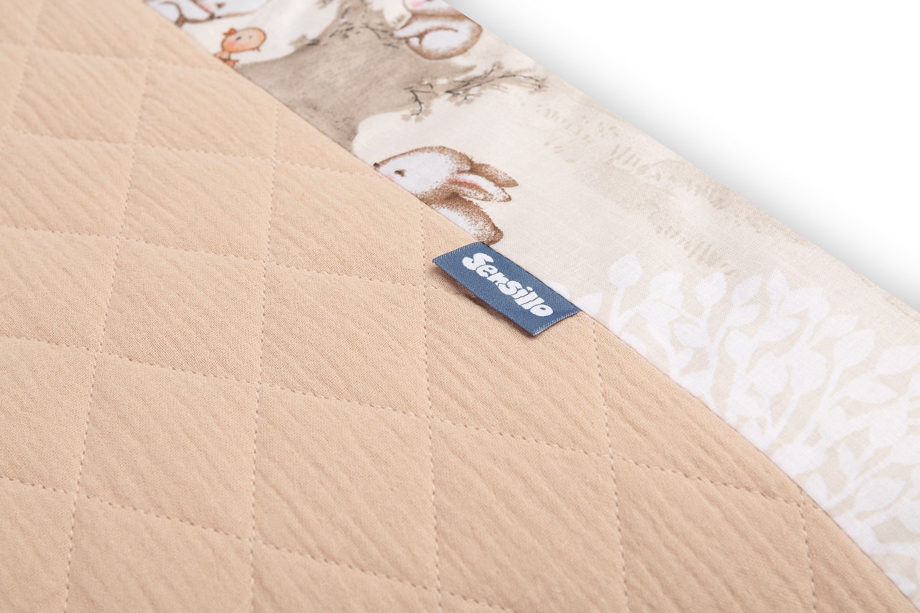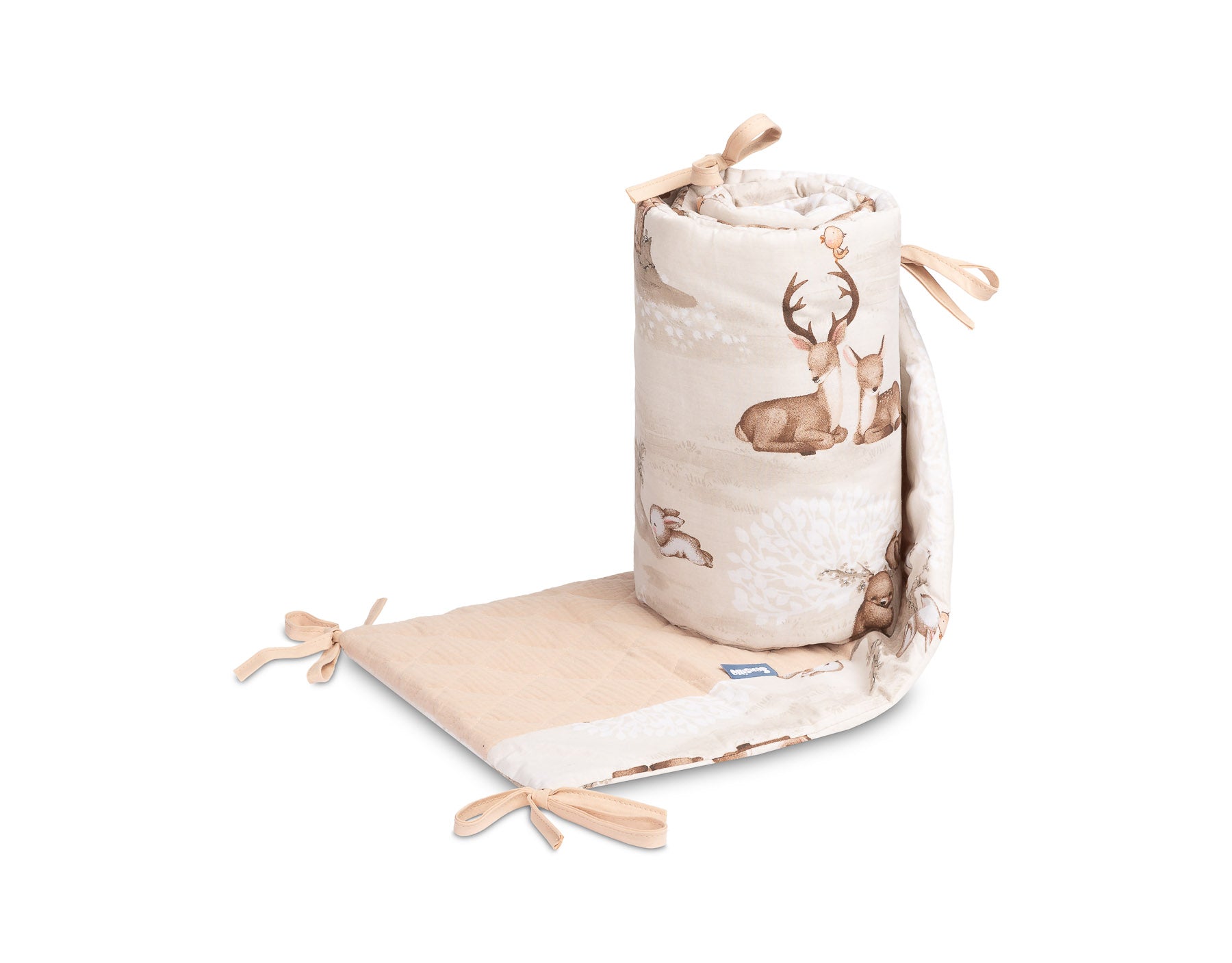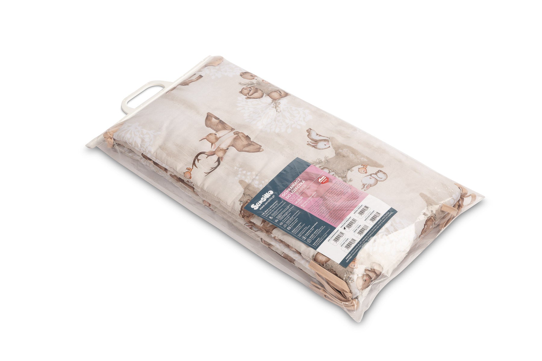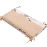 Marginea de protecție pentru pătuț se potrivește fiecărui pătuț standard pentru copii. Marginea este realizată din bumbac moale imprimat și muselină plăcută la atingere. Umplutura din poliester va proteja bebelușul de accidentări în timpul mișcării în pătuț. Marginea rămâne la locul ei datorită panglicilor cu care se fixează de barele pătuțului. Este destinată unui pătuț cu dimensiunile de 120x60 cm. Marginea va fi un accesoriu excelent pentru echipamentul copilului.